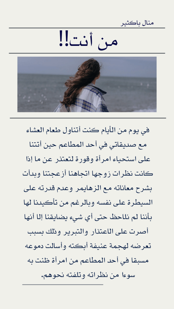 في يوم من الأيام كنت أتناول طعام العشاء مع صديقاتي في أحد المطاعم حين أتتنا على استحياء امرأة وقورة لتعتذر عن ما إذا كانت نظرات زوجها اتجاهنا أزعجتنا وبدأت بشرح معاناته مع الزهايمر وعدم قدرته على السيطرة على نفسه وبالرغم من تأكيدنا لها بأننا لم نلاحظ حتى أي شيء يضايقنا إلا أنها أصرت على الاعتذار والتبرير وذلك بسبب تعرضه لهجمة عنيفة أبكته وأسالت دموعه مسبقا في أحد المطاعم من امرأة ظنت به سوءا من نظراته وتلفته نحوهم.