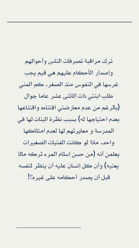 ترك مراقبة تصرفات الناس وأحوالهم وإصدار الأحكام عليهم هي قيم يجب غرسها في النفوس منذ الصغر. كم آلمني طلب ابنتي ذات الاثنى عشر عاما جوال (بالرغم من عدم معارضتي اقتناءه واقتناعها بعدم احتياجها له) بسبب نظرة البنات لها في المدرسة و معايرتهم لها لعدم امتلاكها واحد. ماذا لو كانت الفتيات الصغيرات يعلمن أنه (من حسن إسلام المرء تركه مالا يعنيه) وأن كل إنسان عليه أن ينظر لنفسه قبل أن يصدر أحكامه على غيره؟!