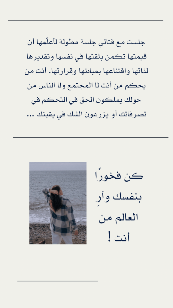 جلست مع فتاتي جلسة مطولة لأعلّمها أن قيمتها تكمن بثقتها في نفسها وتقديرها لذاتها واقتناعها بمبادئها وقرارتها. أنت من يحكم من أنت لا المجتمع ولا الناس من حولك يملكون الحق في التحكم في تصرفاتك أو يزرعون الشك في يقينك …