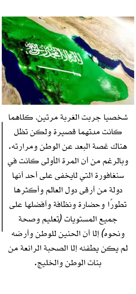 شخصيا جربت الغربة مرتين، كلاهما كانت مدتهما قصيرة ولكن تظل هناك غصة البعد عن الوطن ومرارته. وبالرغم من أن المرة الأولى كانت في سنغافورة التي لايخفى على أحد أنها دولة من أرقى دول العالم وأكثرها تطورًا وحضارة ونظافة وأفضلها على جميع المستويات (تعليم وصحة ونحوه) إلا أن الحنين للوطن وأرضه لم يكن يطفئه إلا الصحبة الرائعة من بنات الوطن والخليج