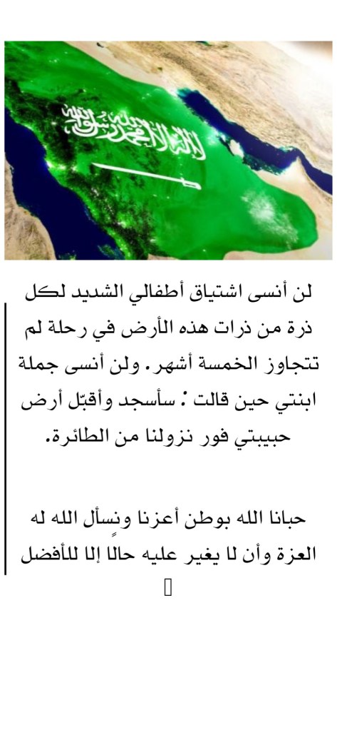 لن أنسى اشتياق أطفالي الشديد لكل ذرة من ذرات هذه الأرض في رحلة لم تتجاوز الخمسة أشهر. ولن أنسى جملة ابنتي حين قالت : سأسجد وأقبّل أرض حبيبتي فور نزولنا من الطائرة.