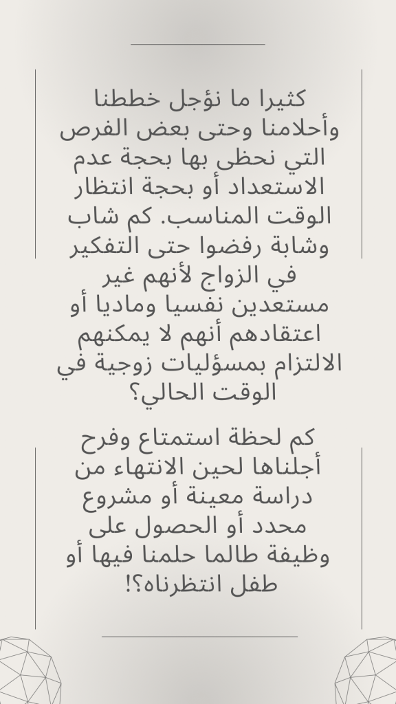 كم لحظة استمتاع وفرح أجلناها لحين الانتهاء من دراسة معينة أو مشروع محدد أو الحصول على وظيفة طالما حلمنا فيها أو طفل انتظرناه؟!