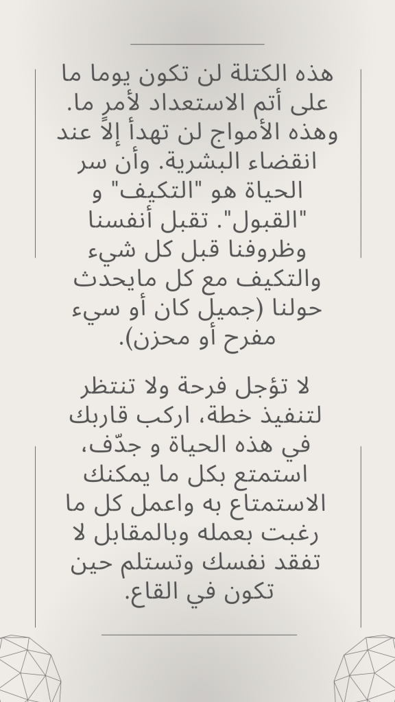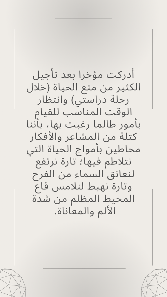 أدركت مؤخرا بعد تأجيل الكثير من متع الحياة (خلال رحلة دراستي) وانتظار الوقت المناسب للقيام بأمور طالما رغبت بها، بأننا كتلة من المشاعر والأفكار محاطين بأمواج الحياة التي نتلاطم فيها؛ تارة نرتفع لنعانق السماء من الفرح وتارة نهبط لنلامس قاع المحيط المظلم من شدة الألم والمعاناة. هذه الكتلة لن تكون يوما ما على أتم الاستعداد لأمرٍ ما. وهذه الأمواج لن تهدأ إلا عند انقضاء البشرية. وأن سر الحياة هو “التكيف” و “القبول”. تقبل أنفسنا وظروفنا قبل كل شيء والتكيف مع كل مايحدث حولنا (جميل كان أو سيء مفرح أو محزن).