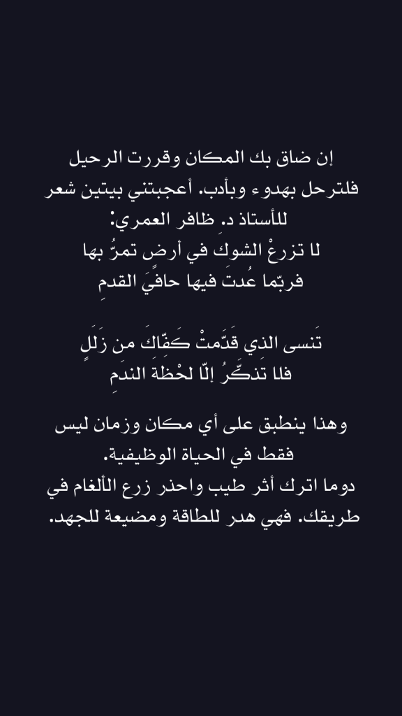 إن ضاق بك المكان وقررت الرحيل فلترحل بهدوء وبأدب. أعجبتني بيتين شعر للأستاذ د. ظافر العمري: