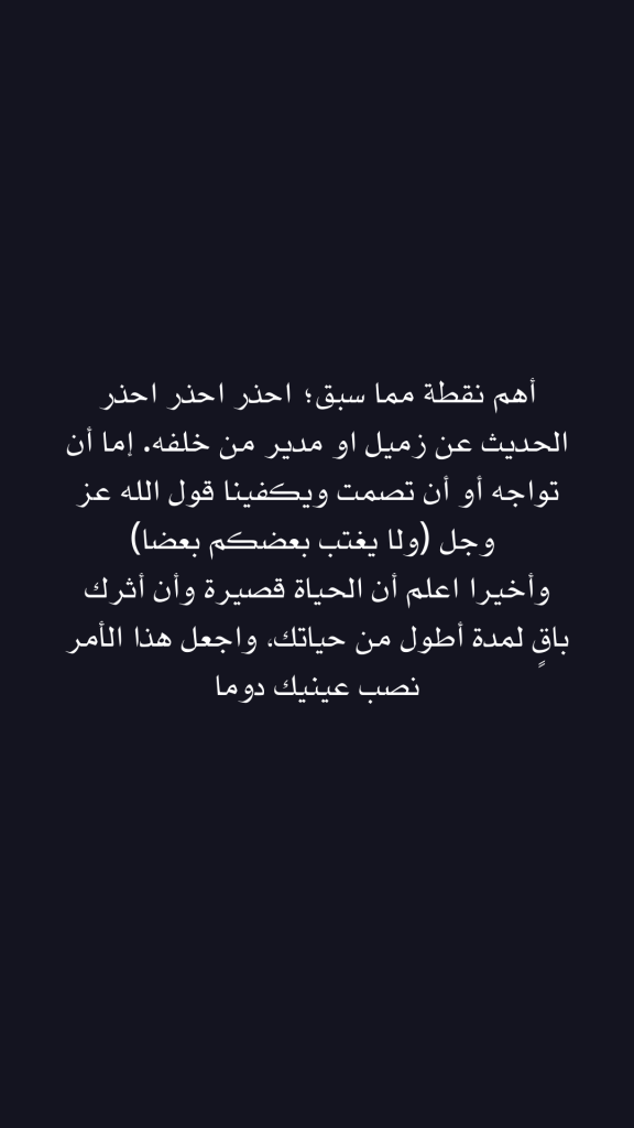 أهم نقطة مما سبق؛ احذر احذر احذر الحديث عن زميل او مدير من خلفه. إما أن تواجه أو أن تصمت ويكفينا قول الله عز وجل (ولا يغتب بعضكم بعضا)