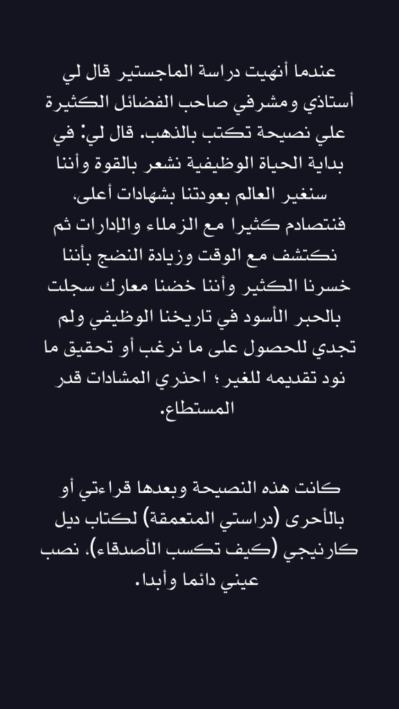 عندما أنهيت دراسة الماجستير قال لي أستاذي ومشرفي صاحب الفضائل الكثيرة علي نصيحة تكتب بالذهب. قال لي: في بداية الحياة الوظيفية نشعر بالقوة وأننا سنغير العالم بعودتنا بشهادات أعلى، فنتصادم كثيرا مع الزملاء والإدارات ثم نكتشف مع الوقت وزيادة النضج بأننا خسرنا الكثير وأننا خضنا معارك سجلت بالحبر الأسود في تاريخنا الوظيفي ولم تجدي للحصول على ما نرغب أو تحقيق ما نود تقديمه للغير؛ احذري المشادات قدر المستطاع.