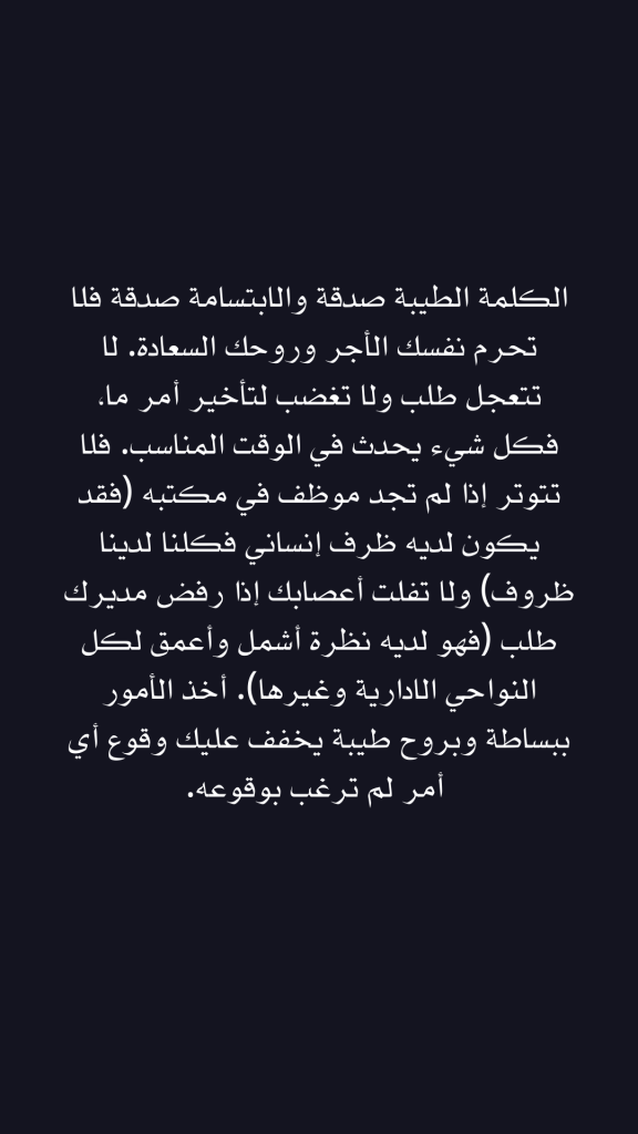 الكلمة الطيبة صدقة والابتسامة صدقة فلا تحرم نفسك الأجر وروحك السعادة. لا تتعجل طلب ولا تغضب لتأخير أمر ما، فكل شيء يحدث في الوقت المناسب. فلا تتوتر إذا لم تجد موظف في مكتبه (فقد يكون لديه ظرف إنساني فكلنا لدينا ظروف) ولا تفلت أعصابك إذا رفض مديرك طلب (فهو لديه نظرة أشمل وأعمق لكل النواحي الادارية وغيرها). أخذ الأمور ببساطة وبروح طيبة يخفف عليك وقوع أي أمر لم ترغب بوقوعه.