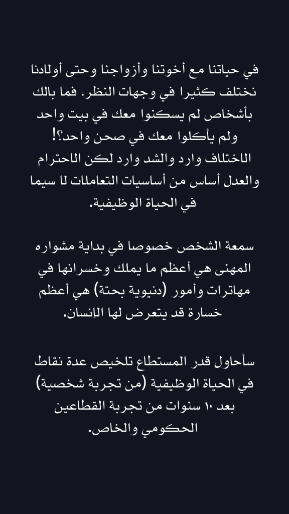 سأحاول قدر المستطاع تلخيص عدة نقاط في الحياة الوظيفية (من تجربة شخصية) بعد ١٠ سنوات من تجربة القطاعين الحكومي والخاص.