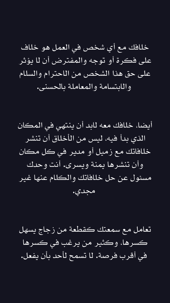 أيضا، خلافك معه لابد أن ينتهي في المكان الذي بدأ فيه، ليس من الأخلاق أن تنشر خلافاتك مع زميل أو مدير في كل مكان وأن تنشرها يمنة ويسرى. أنت وحدك مسئول عن حل خلافاتك والكلام عنها غير مجدي.