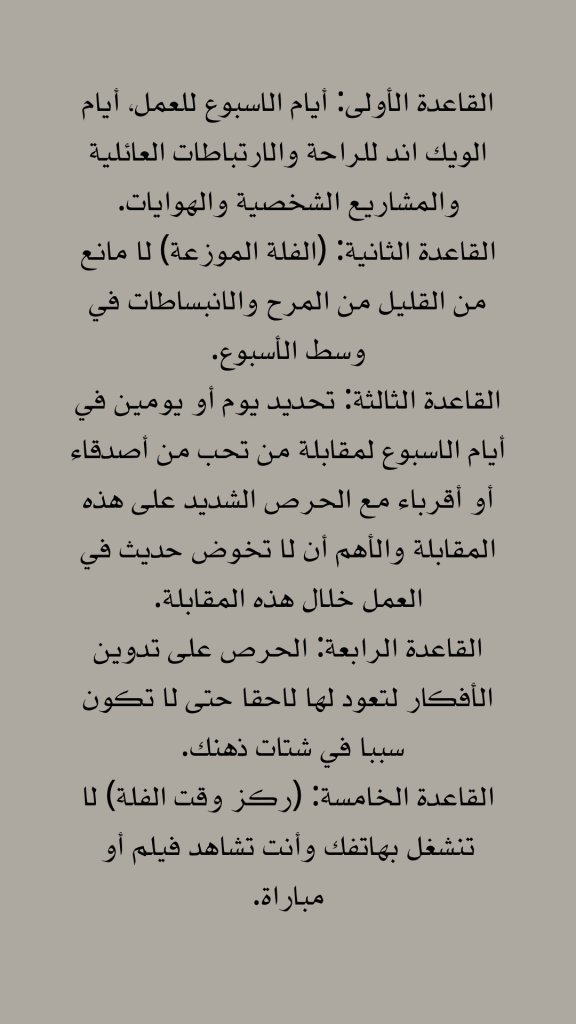 القاعدة الأولى: أيام الاسبوع للعمل، أيام الويك اند للراحة والارتباطات العائلية والمشاريع الشخصية والهوايات.
