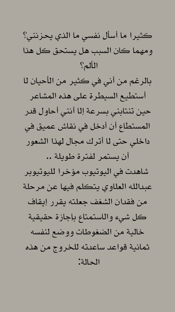 شاهدت في اليوتيوب مؤخرا لليوتيوبر عبدالله العلاوي يتكلم فيها عن مرحلة من فقدان الشغف جعلته يقرر إيقاف كل شيء والاستمتاع بإجازة حقيقية خالية من الضغوطات ووضع لنفسه ثمانية قواعد ساعدته للخروج من هذه الحالة: