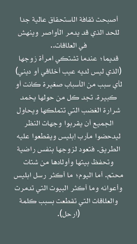 قديما؛ عندما تشتكي امرأة زوجها (الذي ليس لديه عيب أخلاقي أو ديني) لأي سبب من الأسباب صغيرة كانت أو كبيرة، تجد كل من حولها يخمد شرارة الغضب التي تتملكها ويحاول الجميع أن يقربوا وجهات النظر ليدحضوا مآرب إبليس ويقطعوا عليه الطريق. فتعود لزوجها بنفس راضية وتحفظ بيتها وأولادها من شتات محتم. أما اليوم؛ ما أكثر رسل ابليس وأعوانه وما أكثر البيوت التي تدمرت والعلاقات التي تقطعت بسبب كلمة (ارحل).
