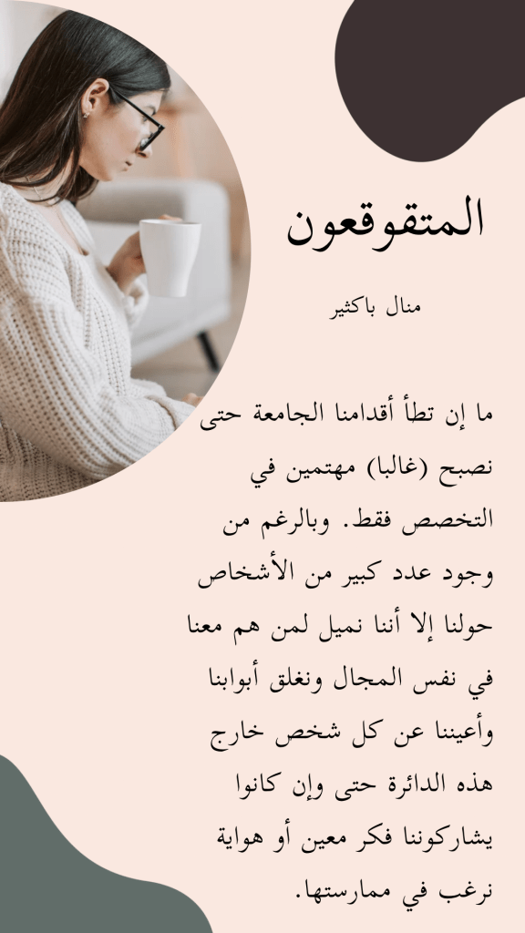 ما إن تطأ أقدامنا الجامعة حتى نصبح (غالبا) مهتمين في التخصص فقط. وبالرغم من وجود عدد كبير من الأشخاص حولنا إلا أننا نميل لمن هم معنا في نفس التخصص ونغلق أبوابنا وأعيننا عن كل شخص خارج هذه الدائرة حتى وإن كانوا يشاركوننا فكر معين أو هواية نرغب في ممارستها.