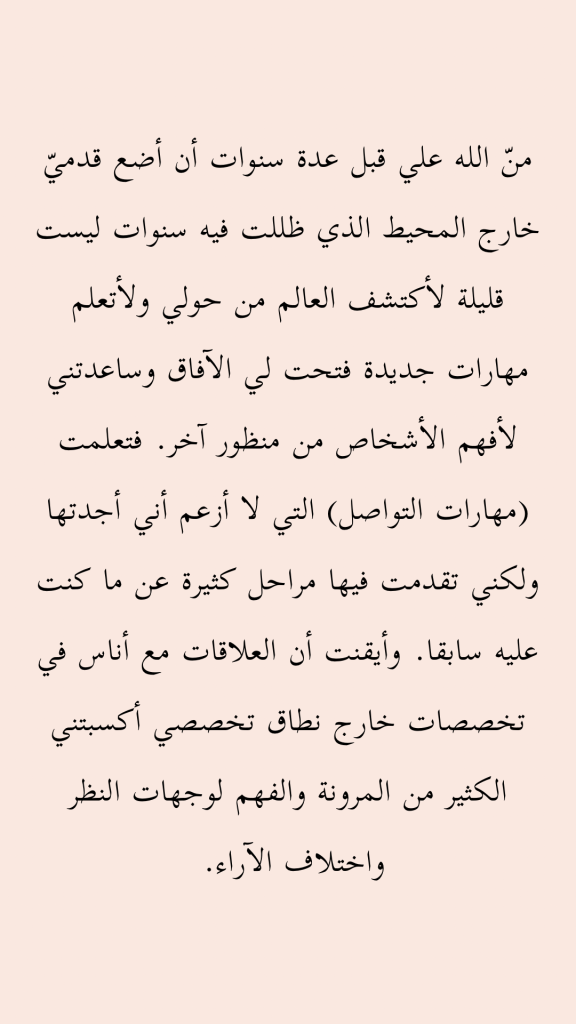 منّ الله علي قبل عدة سنوات أن أضع قدميّ خارج المحيط الذي ظللت فيه سنوات ليست قليلة لأكتشف العالم من حولي ولأتعلم مهارات جديدة فتحت لي الآفاق وساعدتني لأفهم الأشخاص من منظور آخر. فتعلمت (مهارات التواصل) التي لا أزعم أني أجدتها ولكني تقدمت فيها مراحل كثيرة عن ما كنت عليه سابقا. وأيقنت أن العلاقات مع أناس في تخصصات خارج نطاق تخصصي أكسبتني الكثير من المرونة والفهم لوجهات النظر واختلاف الآراء.