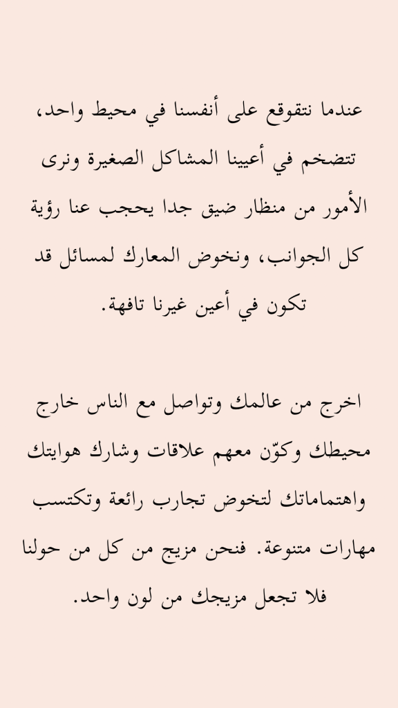 اخرج من عالمك وتواصل مع الناس خارج محيطك وكوّن معهم علاقات وشارك هواياتك واهتماماتك لتخوض تجارب رائعة وتكتسب مهارات متنوعة. فنحن مزيج من كل من حولنا فلا تجعل مزيجك من لون واحد