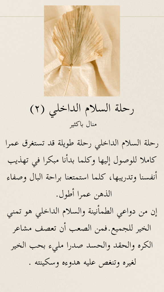 رحلة السلام الداخلي رحلة طويلة قد تستغرق عمرا كاملا للوصول إليها وكلما بدأنا مبكرا في تهذيب أنفسنا وتدريبها، كلما استمتعنا براحة البال وصفاء الذهن عمرا أطول.
