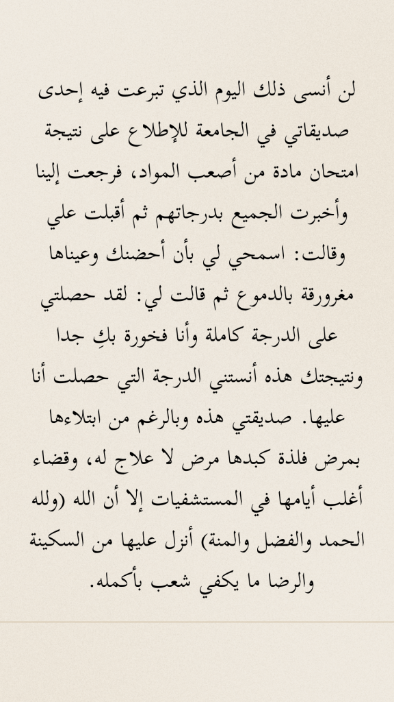 لن أنسى ذلك اليوم الذي تبرعت فيه إحدى صديقاتي في الجامعة للإطلاع على نتيجة امتحان مادة من أصعب المواد، فرجعت إلينا وأخبرت الجميع بدرجاتهم ثم أقبلت علي وقالت: اسمحي لي بأن أحضنك وعيناها مغرورقة بالدموع ثم قالت لي: لقد حصلتي على الدرجة كاملة وأنا فخورة بكِ جدا ونتيجتك هذه أنستني الدرجة التي حصلت أنا عليها. صديقتي هذه وبالرغم من ابتلاءها بمرض فلذة كبدها مرض لا علاج له، وقضاء أغلب أيامها في المستشفيات إلا أن الله (ولله الحمد والفضل والمنة) أنزل عليها من السكينة والرضا ما يكفي شعب بأكمله.