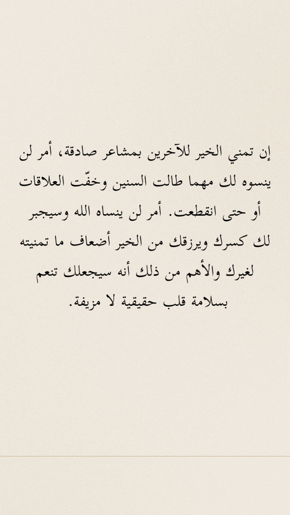 إن تمني الخير للآخرين بمشاعر صادقة، أمر لن ينسوه لك مهما طالت السنين وخفّت العلاقات أو حتى انقطعت. أمر لن ينساه الله وسيجبر لك كسرك ويرزقك من الخير أضعاف ما تمنيته لغيرك والأهم من ذلك أنه سيجعلك تنعم بسلامة قلب حقيقية لا مزيفة.