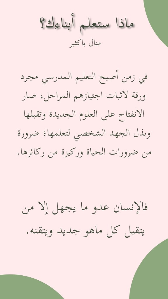 في زمن أصبح التعليم المدرسي مجرد ورقة لاثبات اجتيازهم المراحل، صار الانفتاح على العلوم الجديدة وتقبلها وبذل الجهد الشخصي لتعلمها؛ ضرورة من ضرورات الحياة وركيزة من ركائزها.