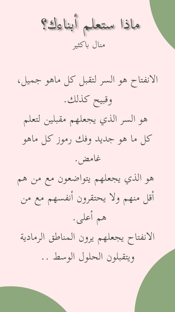 الانفتاح هو السر لتقبل كل ماهو جميل، وقبيح كذلك. هو السر الذي يجعلهم مقبلين لتعلم كل ما هو جديد وفك رموز كل ماهو غامض. هو الذي يجعلهم يتواضعون مع من هم أقل منهم ولا يحتقرون أنفسهم مع من هم أعلى.