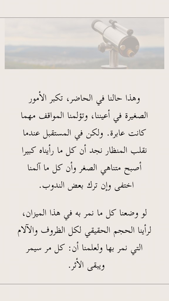 وهذا حالنا في الحاضر، تكبر الأمور الصغيرة في أعيننا، وتؤلمنا المواقف مهما كانت عابرة. ولكن في المستقبل عندما نقلب المنظار نجد أن كل ما رأيناه كبيرا أصبح متناهي الصغر وأن كل ما آلمنا اختفى وإن ترك بعض الندوب.