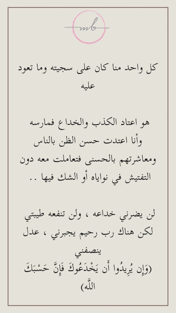 هو اعتاد الكذب والخداع فمارسه، وأنا اعتدت حسن الظن بالناس ومعاشرتهم بالحسنى فتعاملت معه دون التفتيش في نواياه أو الشك فيها ..