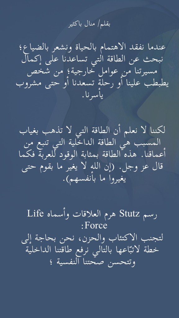 لكننا لا نعلم أن الطاقة التي لا تذهب بغياب المسبب هي الطاقة الداخلية التي تنبع من أعماقنا. هذه الطاقة بمثابة الوقود للعربة فكما قال عز وجل. (إن الله لا يغير ما بقوم حتى يغيروا ما بأنفسهم).