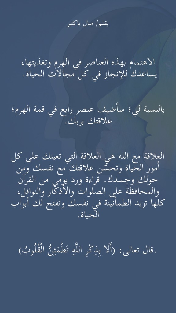 بالنسبة لي؛ سأضيف عنصر رابع في قمة الهرم؛ علاقتك بربك.
