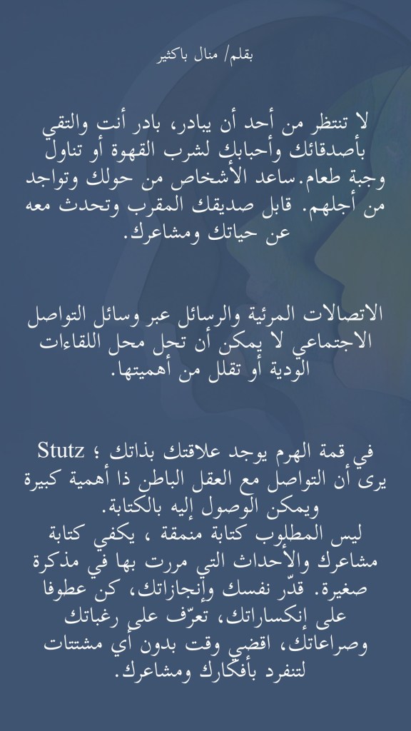 لا تنتظر من أحد أن يبادر، بادر أنت والتقي بأصدقائك وأحبابك لشرب القهوة أو تناول وجبة طعام.ساعد الأشخاص من حولك وتواجد من أجلهم. قابل صديقك المقرب وتحدث معه عن حياتك ومشاعرك.
