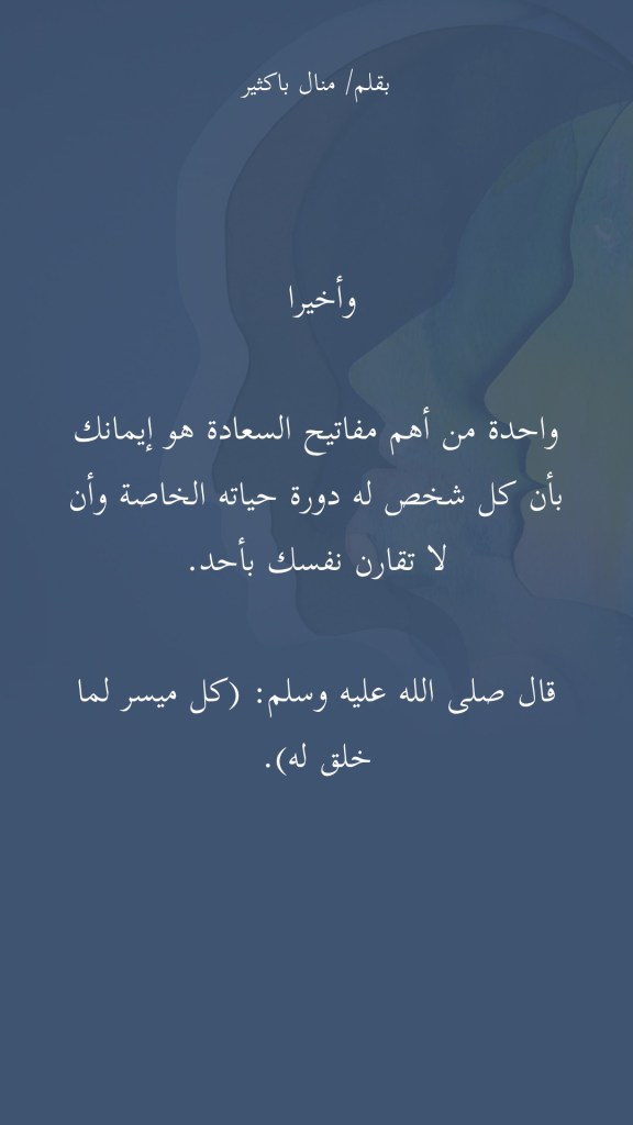 واحدة من أهم مفاتيح السعادة هو إيمانك بأن كل شخص له دورة حياته الخاصة وأن لا تقارن نفسك بأحد.