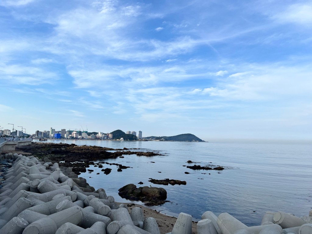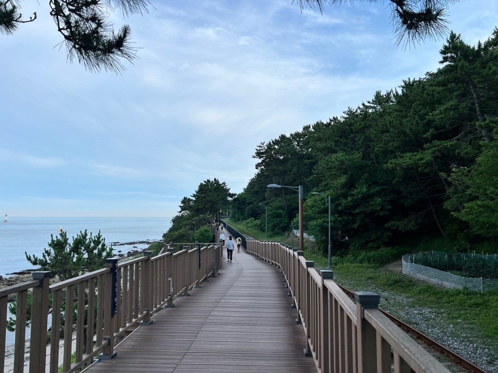 عند الذهاب مشيا من هذا الشاطئ إلى المحطة التي تسبقها Gudeokpo (وهي منطقة جميلة تتسم بالهدوء وبها عدة مطاعم ومقاهي ذات جلسات وإطلالات ساحرة) ؛ كل ماتراه هو ممشى قديم عن يمينه مباني وضع الزمن عليها بصمته وعن شماله شواطئ عذراء لم تعبث بها يد إنسان ولم تقتل براءتها مشاريعه، وكل ما تسمعه هو صوت البحر وتغريد العصافير. فما أجملها من خلوة مع النفس!