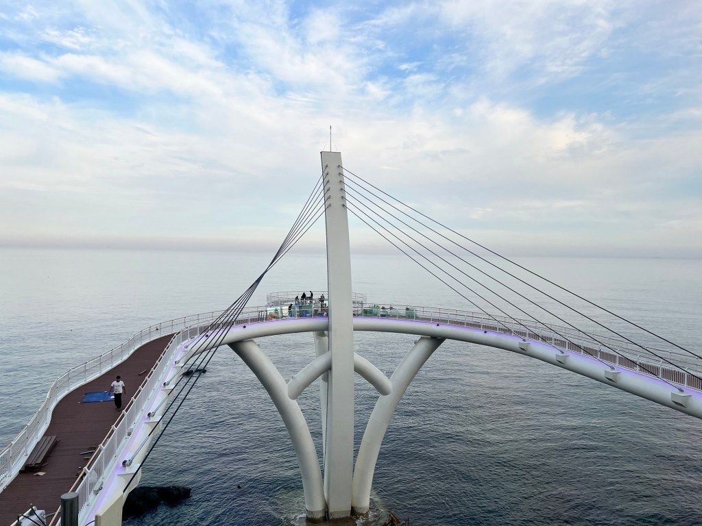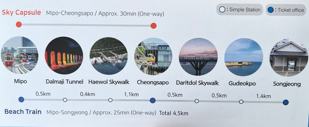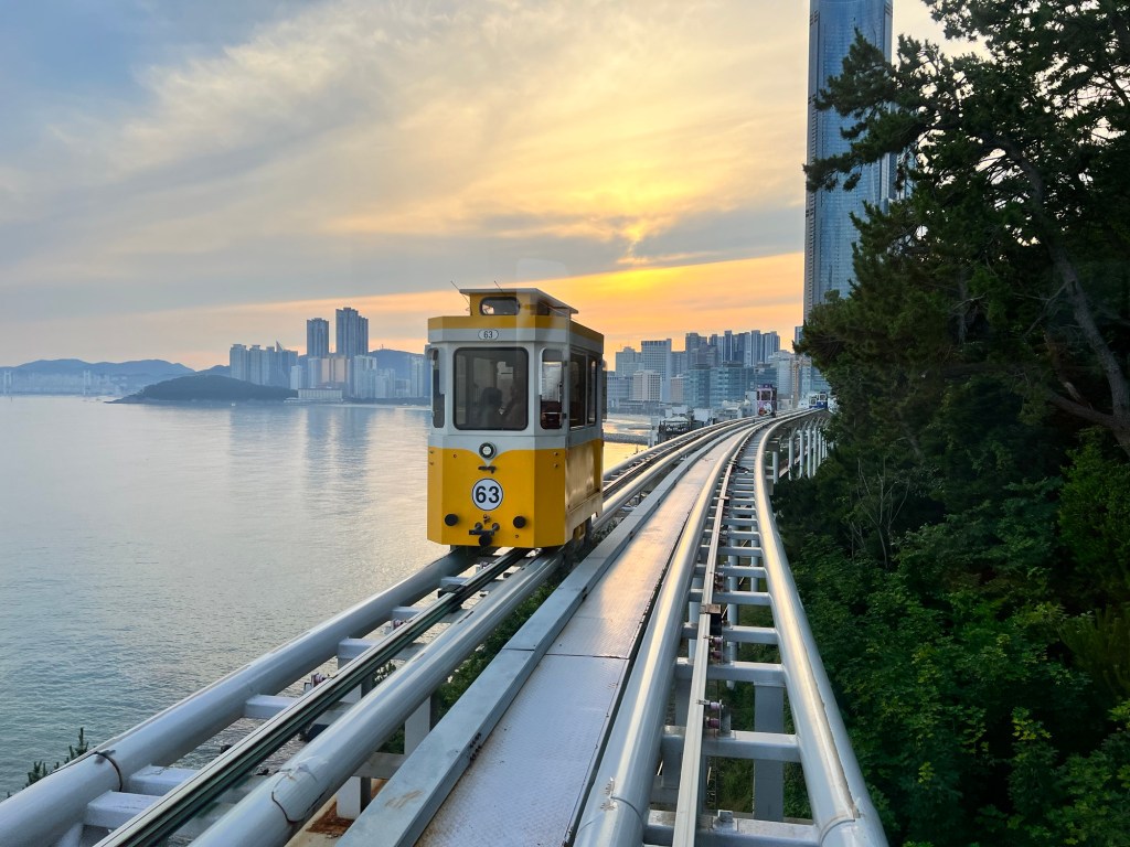المشهورة بالعربات التي تعبر فوق بحر بوسان والقطار الذي يسير موازي للبحر ويقف في عدة محطات.