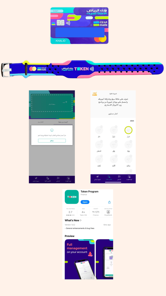 منذ عدة أشهر وأنا أبحث عن منتج يعطي الأطفال تجربة بنكية متكاملة تساعدهم على تطوير مهاراتهم في التعامل مع المال وأخيرا وجدت هذا المنتج الذي توجهنا له بسرعة شديدة بالرغم من عدم توفر اي إعلانات عنه وبالرغم من أننا لسنا عملاء للبنك المقدم له ألا وهو منتج (توكن) من بنك الرياض والذي لا يوفر فقط برنامج خاص بالأطفال وبطاقة وأسورة، ولكنه (يُفترض) بأنه يُقدم بالشراكة مع بنك التنمية الاجتماعية محفظة ادخارية مدعومة لمدة ثلاثة سنوات بنقاط ومكافآت مع فيديوهات تعليمية من خلال البرنامج.